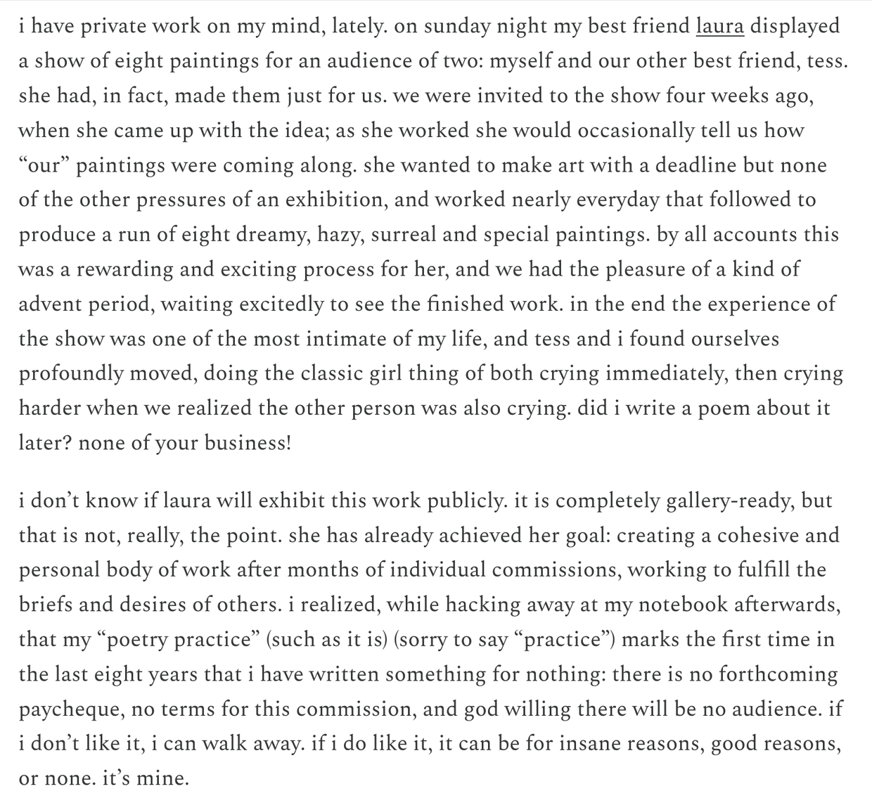 "text": "On the critical importance of private work, and making things for just you (and your friends)\n\nhttps://monicaheiseyworklife.substack.com/p/work-for-your-eyes-only\n\n#Art #Poetry #Painting #Software #SmallWeb #IndieWeb #WebDev"