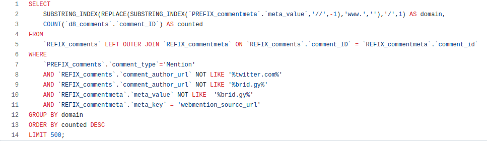 My first version pulled from the comments table only, but the source of the mention did not always get recorded. So I “left joined” the comment meta and looked up the domain there.