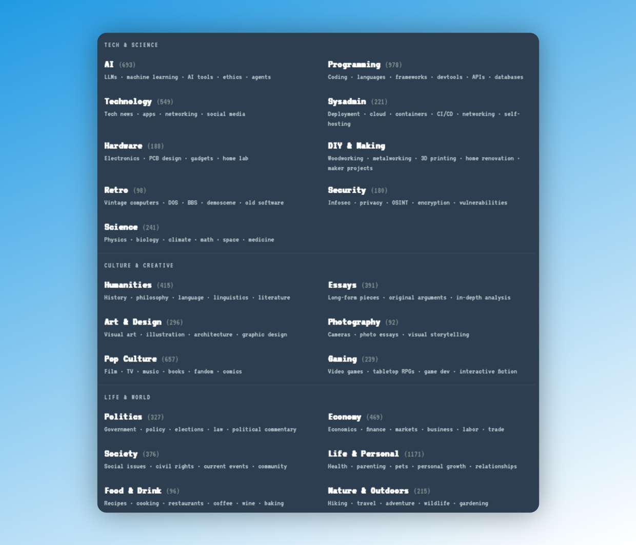 Kagi Small Web now has categories! Browse and discover amazing blogs, personal sites, and hidden gems in the topics you care about most: