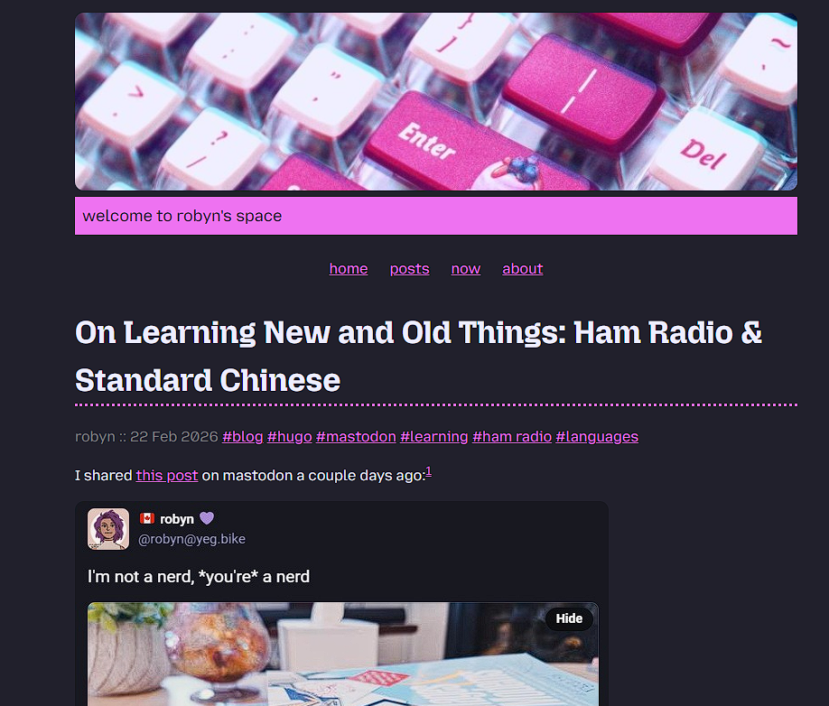 "html": "<p>OK so. I had been planning to update my little <a href=\"https://yeg.bike/tags/smallWeb\">#<span>smallWeb</span></a> <a href=\"https://yeg.bike/tags/indieWeb\">#<span>indieWeb</span></a> site with a new <a href=\"https://yeg.bike/tags/Now\">#<span>Now</span></a> post. </p><p>And then... I kept writing... and writing...</p><p>So if you're interested in any of the following:<br /> - a complete newbie's take on a <a href=\"https://yeg.bike/tags/HamRadio\">#<span>HamRadio</span></a> prep course, and<br />- how this relates to junior high physics classes, and also<br />- learning <a href=\"https://yeg.bike/tags/Chinese\">#<span>Chinese</span></a> (\u666e\u901a\u8bdd) again after over a decade of taking a break - </p><p>maybe it'll be of interest to you \ud83d\ude04</p><p><a href=\"https://robyn.digital/2026/02/on-learning-new-and-old-things-ham-radio-standard-chinese/\"><span>https://</span><span>robyn.digital/2026/02/on-learn</span><span>ing-new-and-old-things-ham-radio-standard-chinese/</span></a></p><p><a href=\"https://yeg.bike/tags/languageLearning\">#<span>languageLearning</span></a></p>",