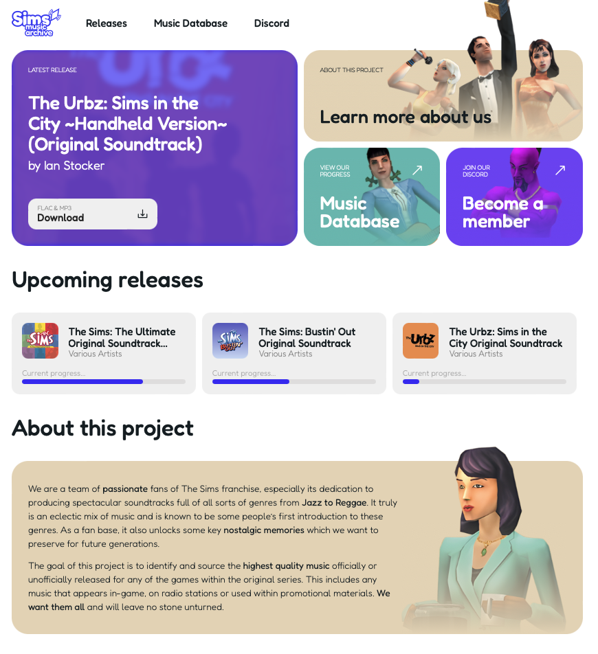 a The Sims series lossless soundtrack archival project died incomplete a couple of years ago, but i give them a 10/10 for nailing the Sims (2000) web aesthetic for their project site