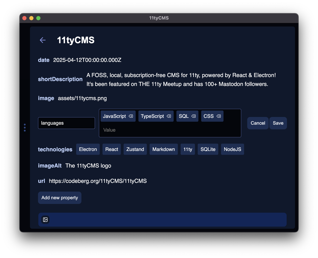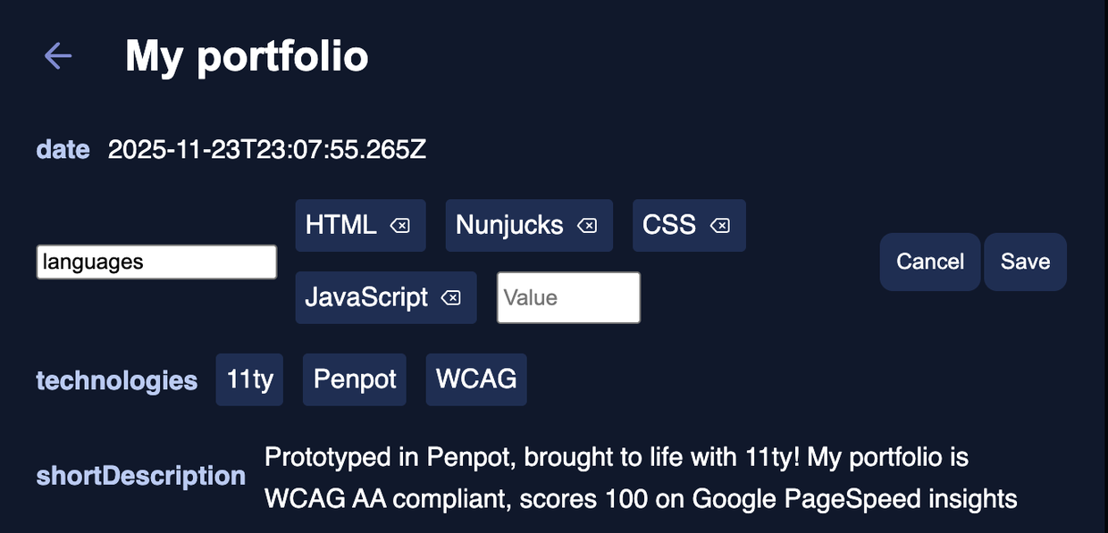 The metadata editor will support string arrays in the next update 👀 #11ty #11tyCMS #IndieWeb