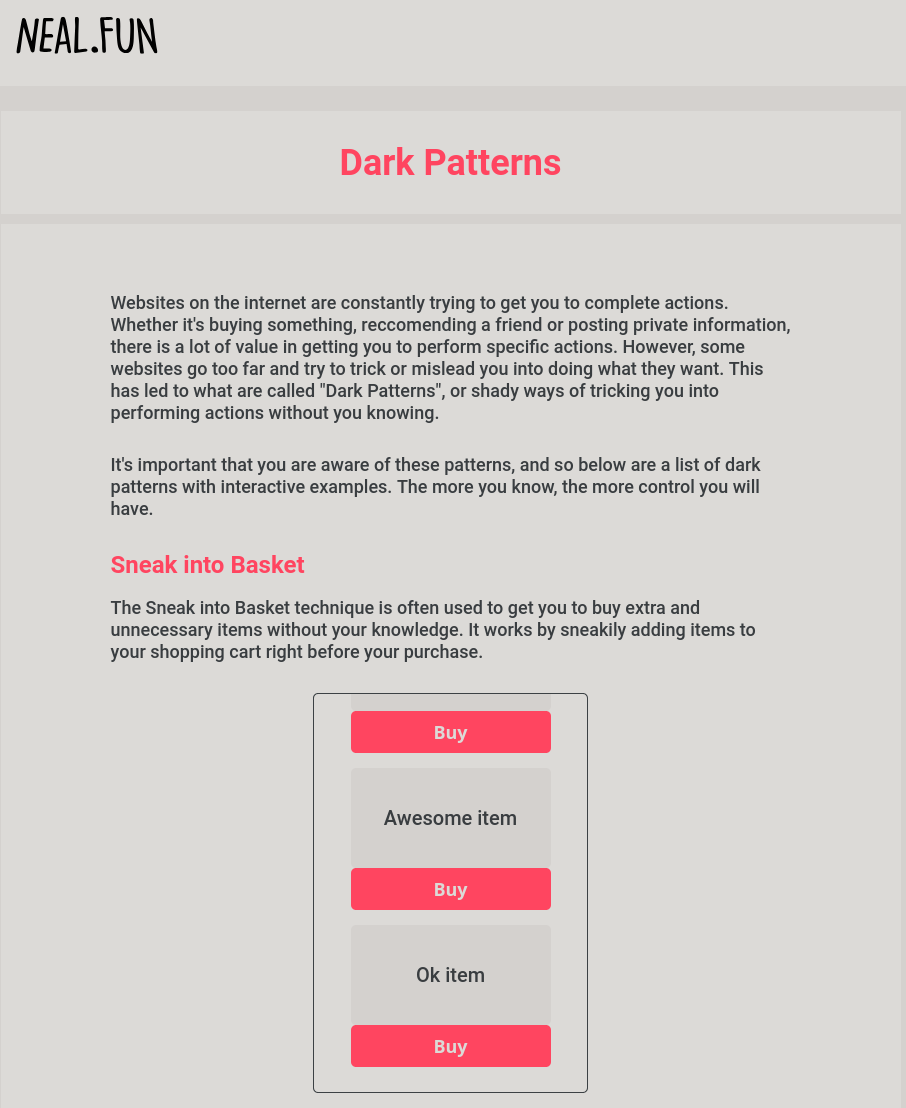 "text": "https://neal.fun/dark-patterns/ this link will lead you to a small list of dark patterns that different companies using to take your attention and money. I hope this will help you (whoever you are) with better using that you already have. #indieweb #darkpattern #web"