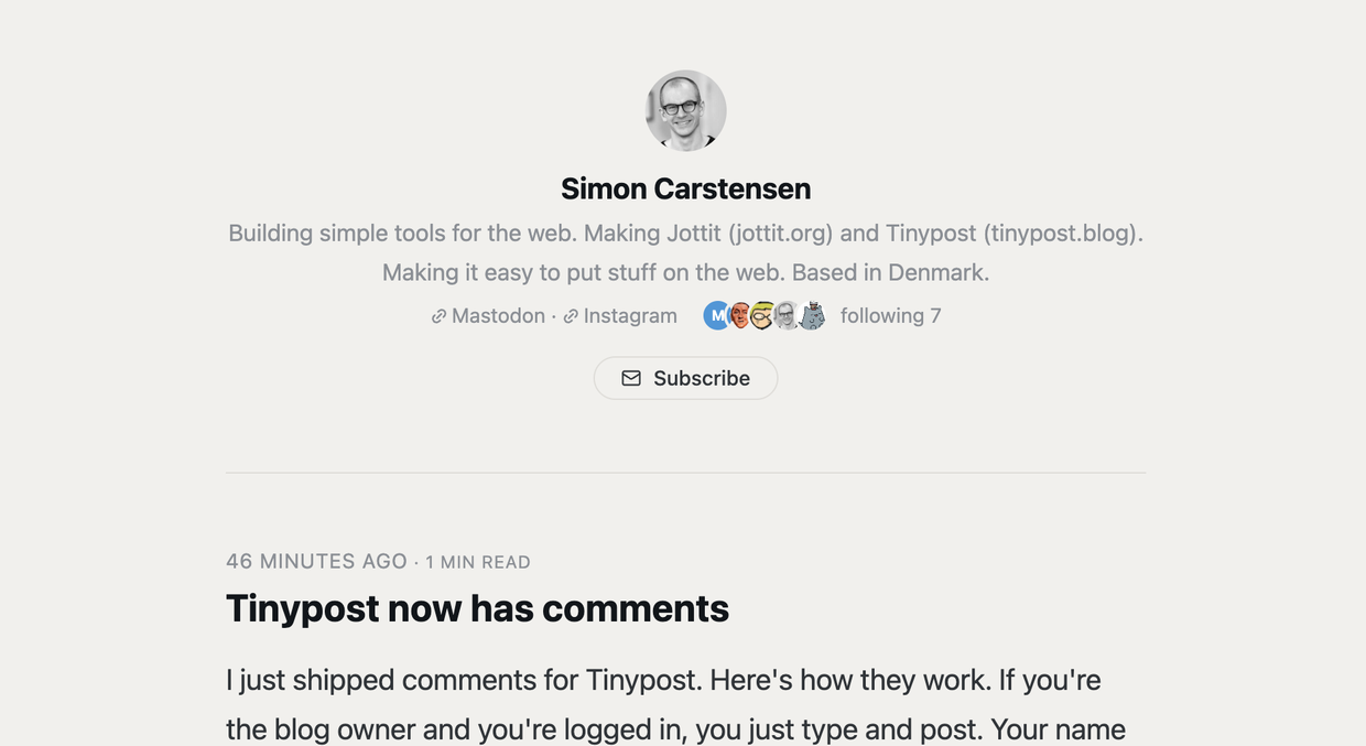 "text": "Redesigned the blogroll on Tinypost today. Single column now, sorted by latest activity, with favicons pulled from RSS feeds. The blogroll also moved into the profile header as a row of stacked avatars linking to the full list. Much more compact than the old two-column grid. https://tinypost.blog #tinypost #indieweb #blogging"