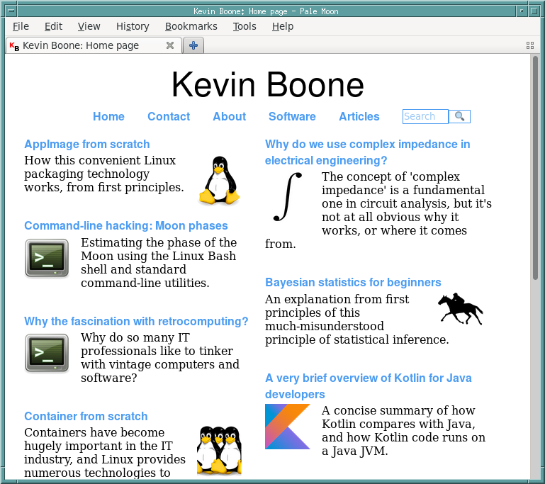 I really like personal homepages and have quite a list of them bookmarked. I'll post one every week unless I fall behind this schedule. ð So here's Cool Personal Homepages #CPHP Vol. 64: "Kevin Boone: Home page" https://kevinboone.me/
