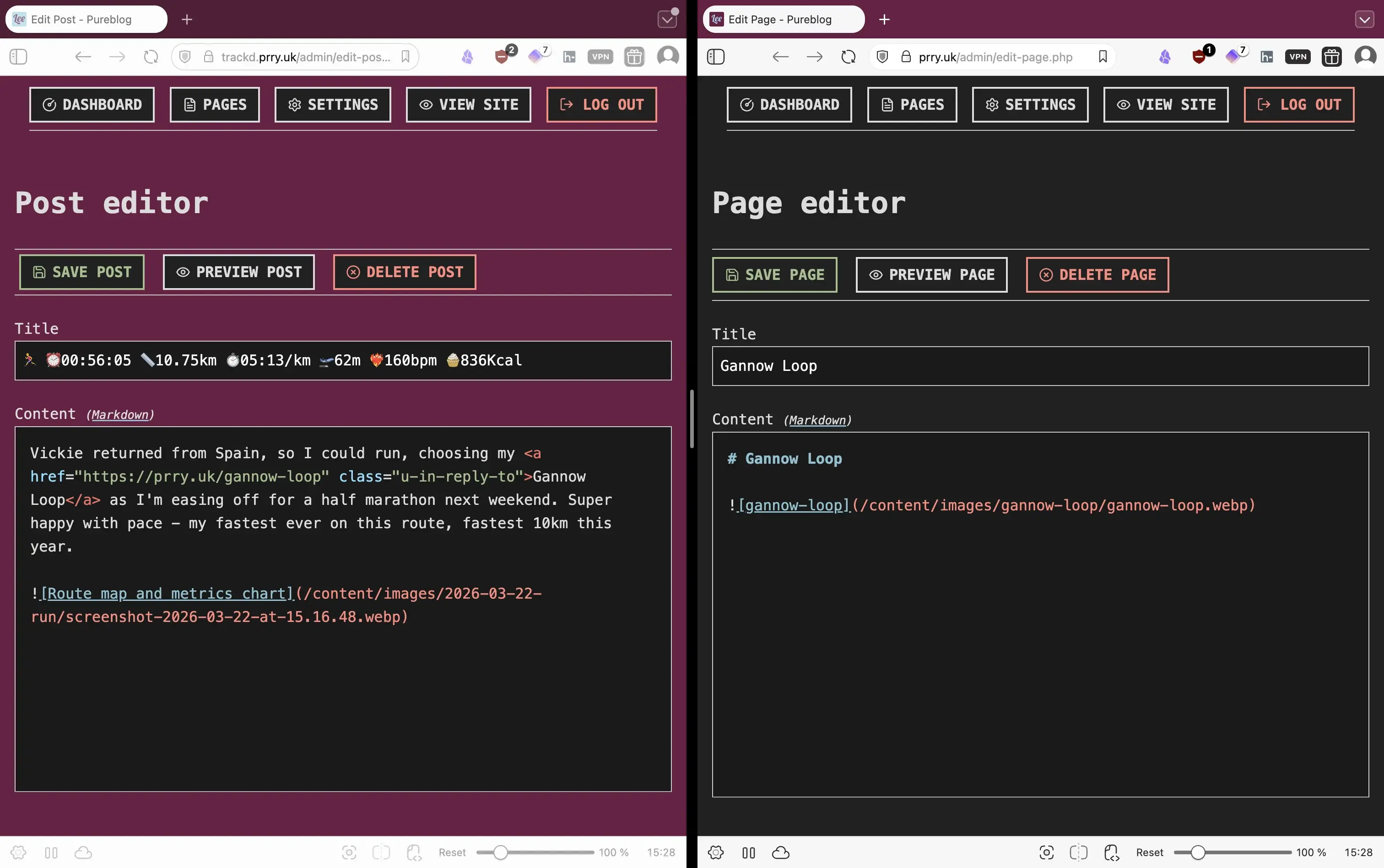"text": "One of the quirk's of my Pure Blog switch is that I've split short activity logging posts off into a second site to clean my rss feed. Here I've reversed the favicon colors and styled the dashboards so I can tell which admin console I'm in!\n\n\ud83d\udd16 #indieWeb #PureBlog\nhttps://prry.uk/2026-03-22-1533"