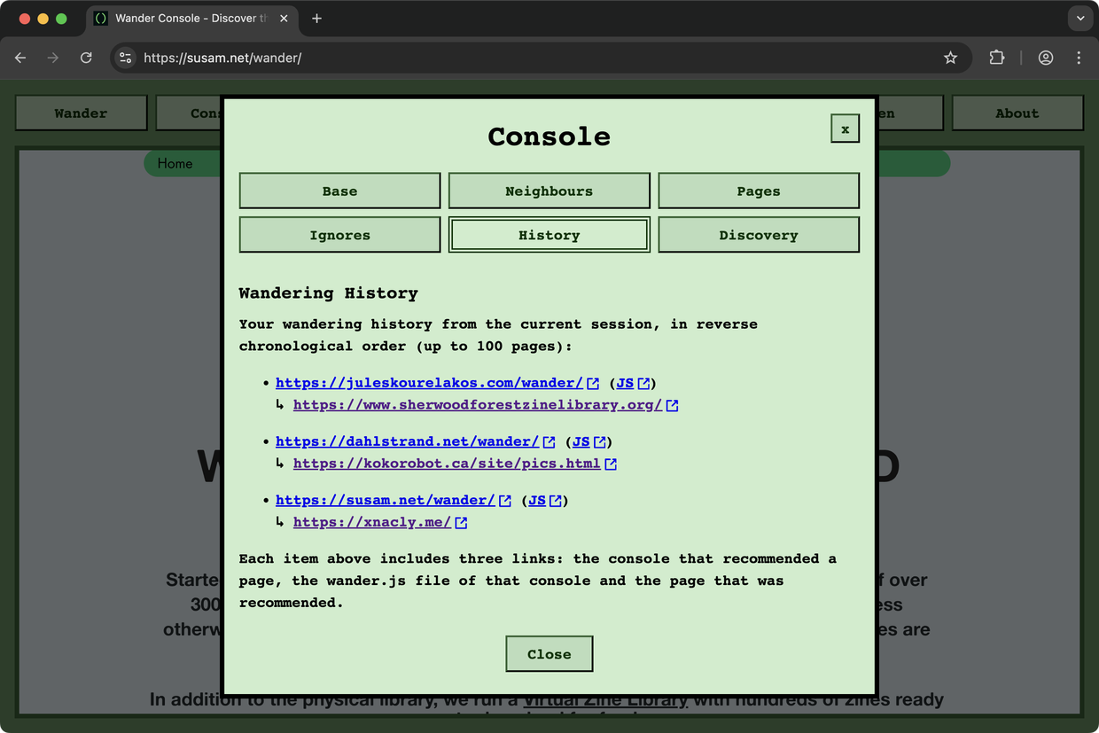 "text": "Wander 0.3.0 is out.\n\nThis is the third release of this small, decentralised, self-hosted tool for discovering the smol web.\n\nThis release brings fixes for unnecessary horizontal scrolling, some websites failing to load due to <iframe> sandbox restrictions and duplicate page recommendations appearing too close together.\n\nFor more details, see: https://codeberg.org/susam/wander/src/branch/main/CHANGES.md#0-3-0-2026-03-25\n\nTo try the Wander Console, go to: https://susam.net/wander/\n\n#programming #html #javascript #indieweb"