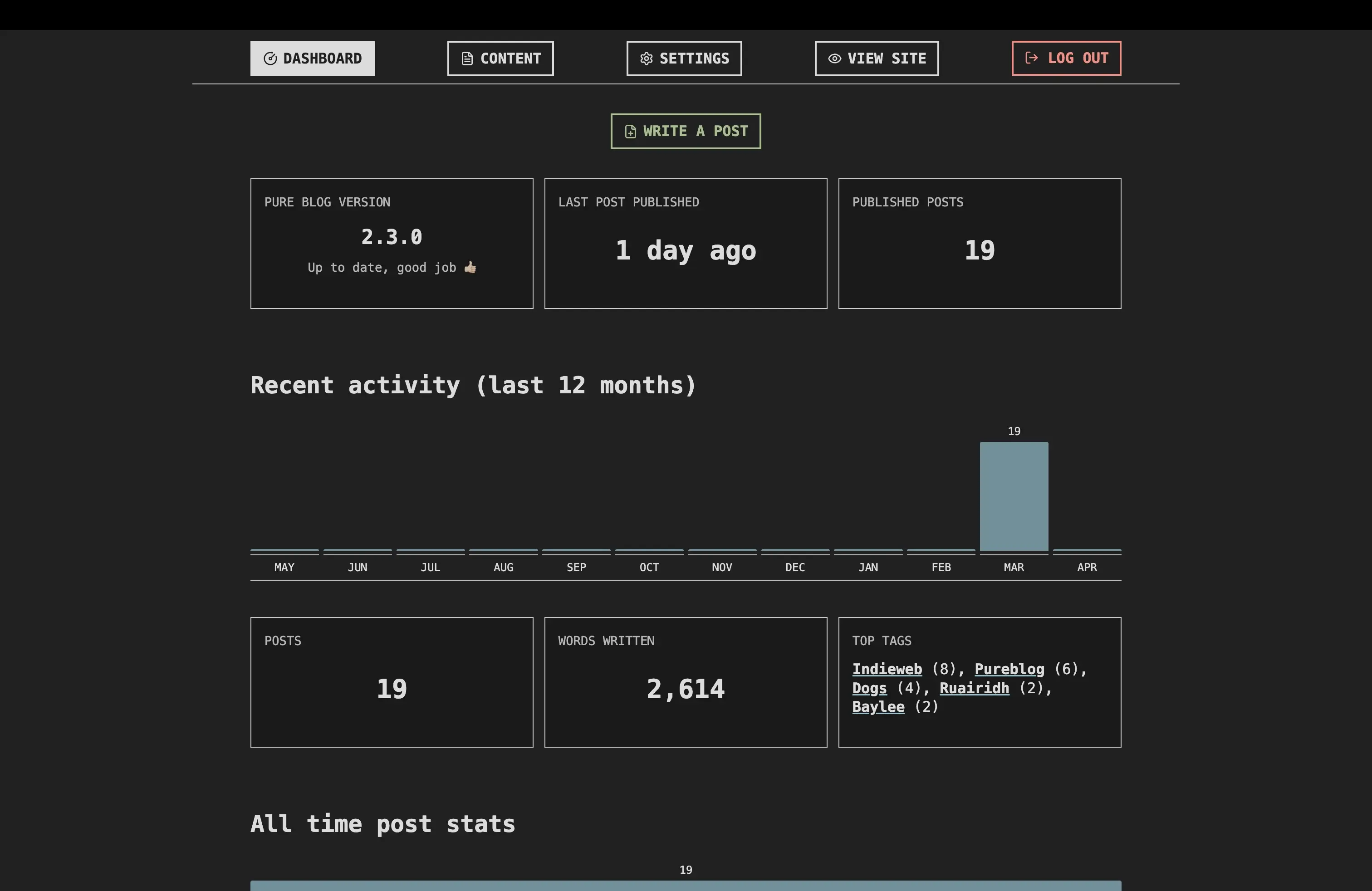 I see that Kev is not entirely succeeding at dialling back the rate of development on Pureblog. Here's a couple of screenshots of the new admin stats page which is really neat.