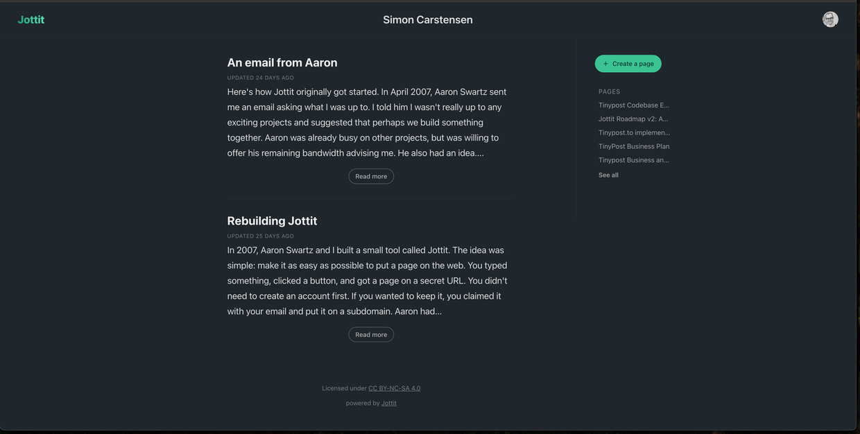 "text": "Spent the day redesigning Jottit. Shipped dark mode, a new site header and a new owner sidebar with pinned/recent pages.\n\nThe sidebar went through 20 iterations and eventually ended up with a right-side layout: content on the left, page navigation on the right.\n\nI've come full circle: the new design pretty much mirrors what Aaron and I built 19 years ago. Some patterns just work :) #jottit #indieweb"