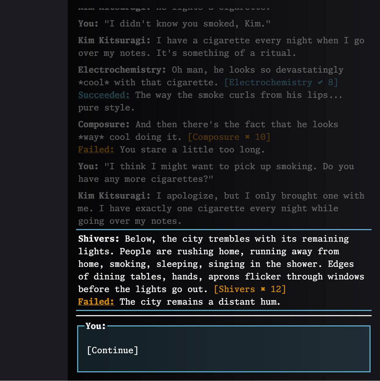Made a little Disco Elysium-like dialog thing. Very simple, very boring, but hey, it works! Includes 2d6+stat dice rolling, skill checks, variables, branching, conditions, effects, and more :)