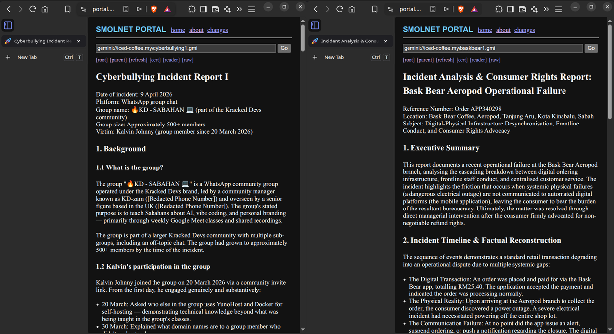 "html": "<p>I have updated my Gemini capsule! <a href=\"https://mastodon.social/@kalvin0x8d0/116377313989616661\"><span></span><span>gemini://iced-coffee.my/</span><span></span></a> <a href=\"https://iced-coffee.my/\"><span>https://</span><span>iced-coffee.my/</span><span></span></a></p><p><a href=\"https://mastodon.social/tags/gemini\">#<span>gemini</span></a> <a href=\"https://mastodon.social/tags/web\">#<span>web</span></a> <a href=\"https://mastodon.social/tags/internet\">#<span>internet</span></a> <a href=\"https://mastodon.social/tags/tech\">#<span>tech</span></a> <a href=\"https://mastodon.social/tags/opensource\">#<span>opensource</span></a> <a href=\"https://mastodon.social/tags/selfhosted\">#<span>selfhosted</span></a> <a href=\"https://mastodon.social/tags/minimalism\">#<span>minimalism</span></a> <a href=\"https://mastodon.social/tags/design\">#<span>design</span></a> <a href=\"https://mastodon.social/tags/documentation\">#<span>documentation</span></a> <a href=\"https://mastodon.social/tags/report\">#<span>report</span></a> <a href=\"https://mastodon.social/tags/cybersecurity\">#<span>cybersecurity</span></a> <a href=\"https://mastodon.social/tags/privacy\">#<span>privacy</span></a> <a href=\"https://mastodon.social/tags/developer\">#<span>developer</span></a> <a href=\"https://mastodon.social/tags/coding\">#<span>coding</span></a> <a href=\"https://mastodon.social/tags/linux\">#<span>linux</span></a> <a href=\"https://mastodon.social/tags/community\">#<span>community</span></a> <a href=\"https://mastodon.social/tags/advocacy\">#<span>advocacy</span></a> <a href=\"https://mastodon.social/tags/digital\">#<span>digital</span></a> <a href=\"https://mastodon.social/tags/writing\">#<span>writing</span></a> <a href=\"https://mastodon.social/tags/indieweb\">#<span>indieweb</span></a></p>",