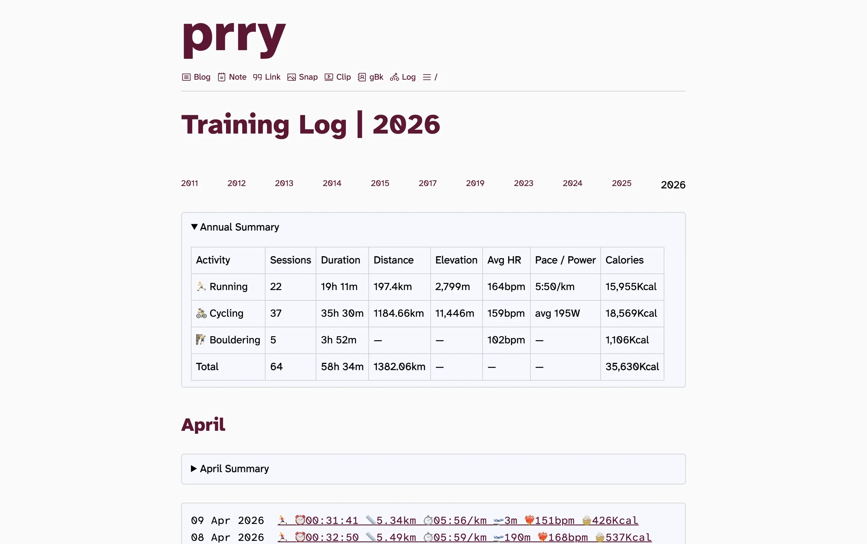 "html": "<p>I've added some data analysis into my training log so that it can total up and average out across months and years - only from 2024 onwards until I format and add earlier data.</p><p><a href=\"https://social.lol/tags/Indieweb\">#<span>Indieweb</span></a> <a href=\"https://social.lol/tags/Pureblog\">#<span>Pureblog</span></a> <a href=\"https://social.lol/tags/Changelog\">#<span>Changelog</span></a></p><p><a href=\"https://prry.uk/2026-04-09-2137\"><span>https://</span><span>prry.uk/2026-04-09-2137</span><span></span></a></p>",