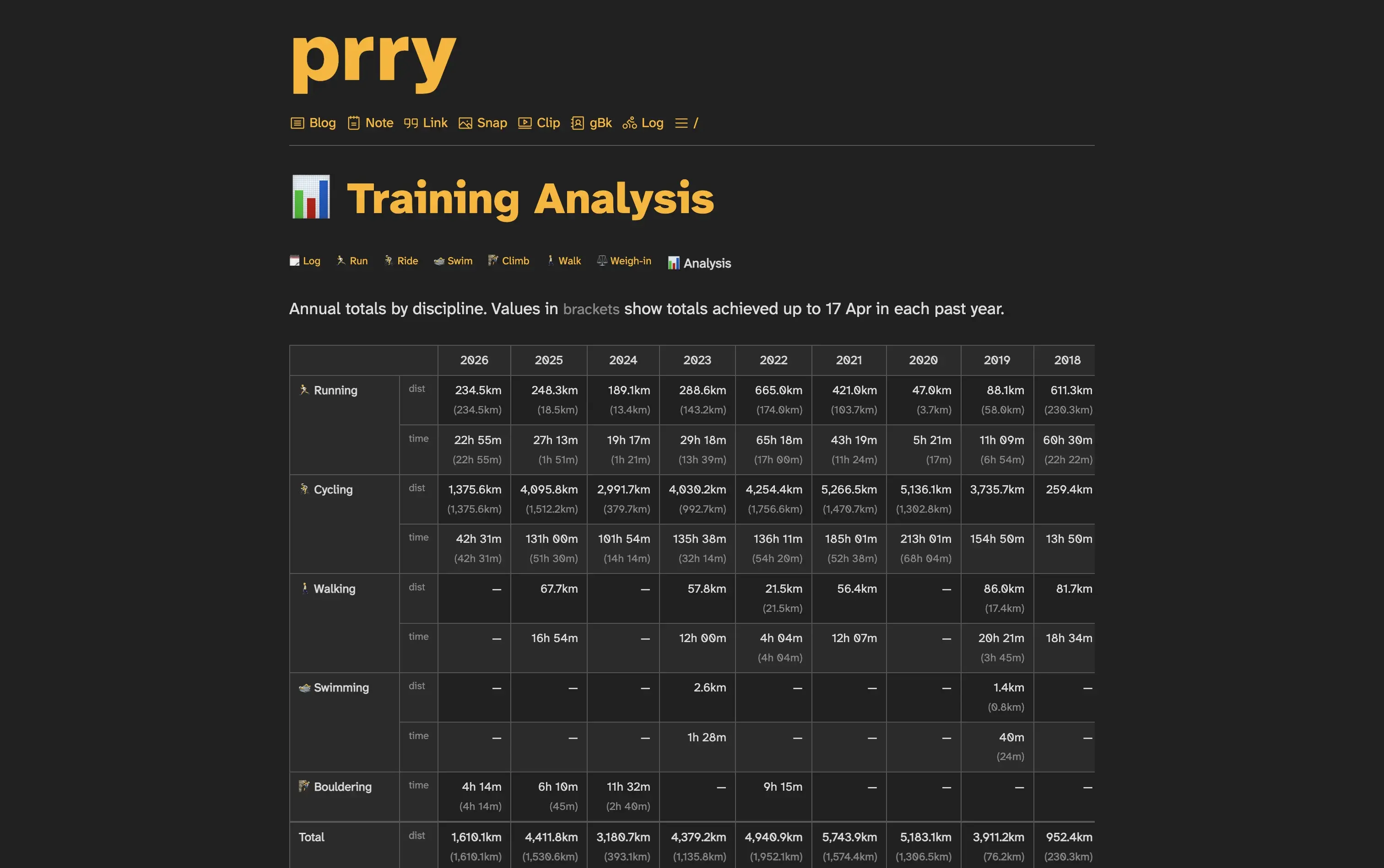 "text": "For the first time ever I now have my entire training log on my website, and last night I created this data analysis (https://prry.uk/log/stats) to show total training volume v discipline by year, and by point in year.\n\nNot quite POSSE, I'd like to be able to actually import, map out, and analyses the gpx files in future.\n\nI am worried about the impact on speed, so need to try to work out how to replicate this using yaml.\n\n#Indieweb #PureBlog #Changelog\n\nhttps://prry.uk/2026-04-17-0714"