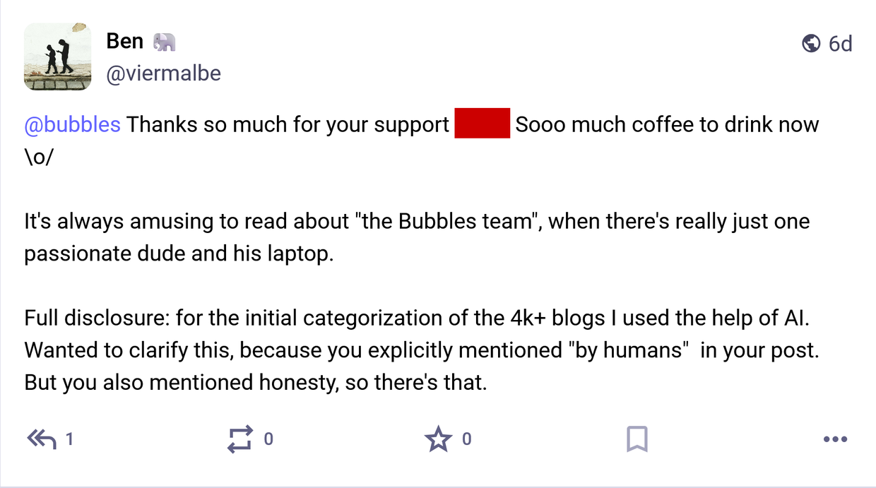 "text": "Hey so if you're the kind of person who cares about this kind of thing, Bubbles.town's labeling is being done with AI, which I suspect means that it's been fed your blogs regardless of what your robots.txt/ai.txt says\n\nI was really excited about this project until I learned this. The site does not disclose that AI was used, I had to go digging through the dev's replies to find this. It's really disappointing to see for something purporting to be for the indie web\n\n#IndieWeb #Blogging #Blog"